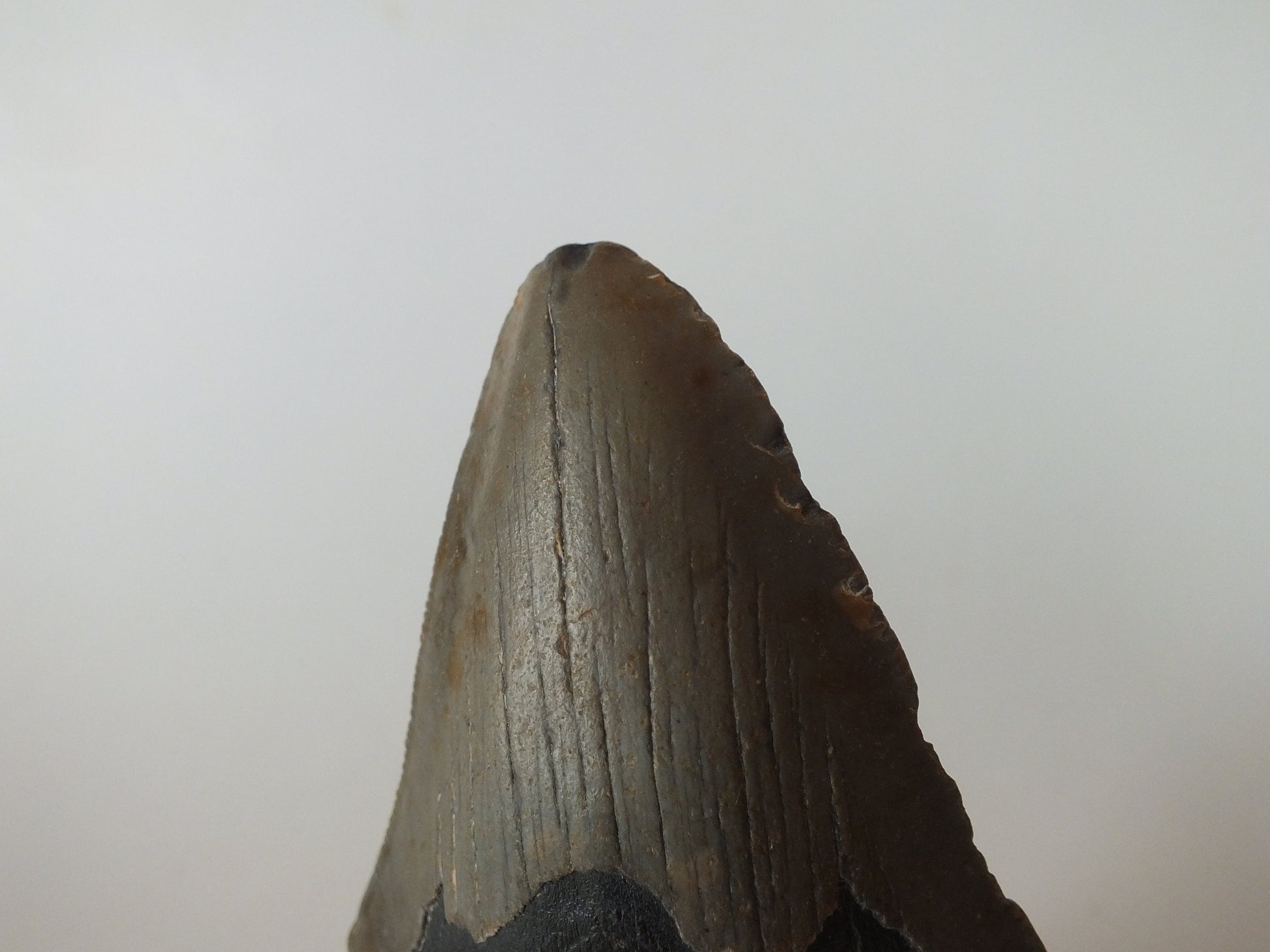 The largest fish that ever lived, the Megalodon (Carcharocles Megalodon), ruled the seas from the early Miocene Epoch until the end of the Pliocene Epoch (2.58 million years ago). With a bite several times larger than the current day shark, they measured up to 18 meters long and weighed up to 65 metric tons. The largest recovered Megalodon tooth measures 6.9 inches long, and distinctly has a dark chevron shape near the root.