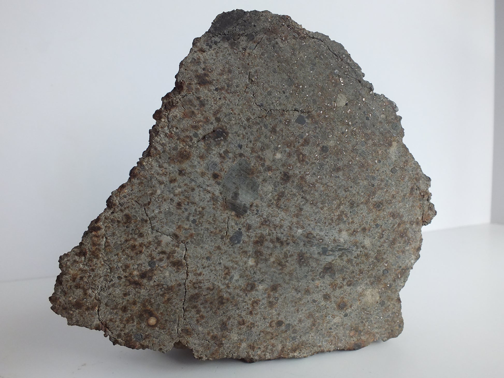 A high grade meteorite slab showing many metallic chondrules, as well as a few armoured chondrules. It has a beautiful fusion crust and would make a very nice display for anyone's collection.