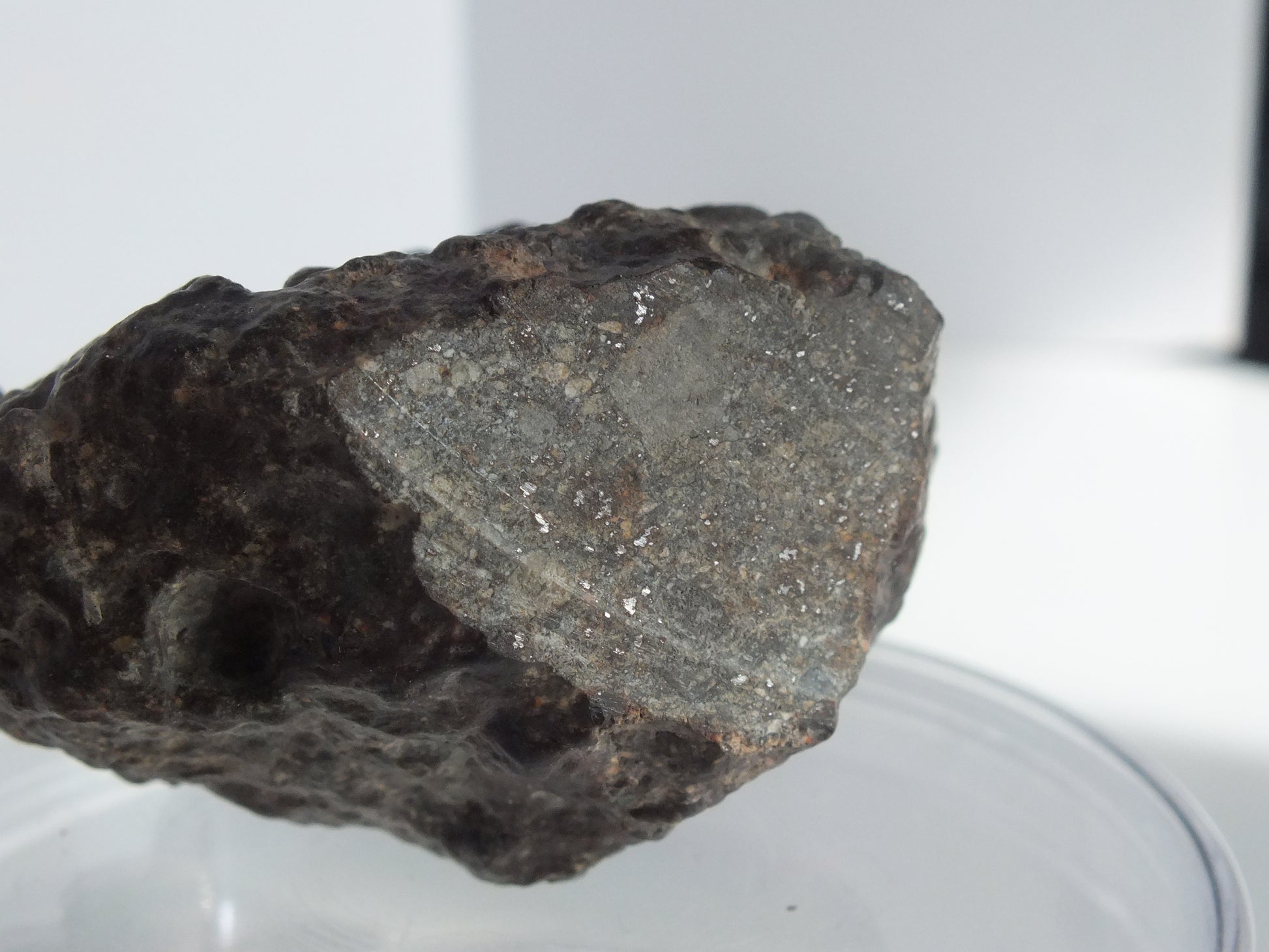 A nice large meteorite with a cut window and visible iron condrules.